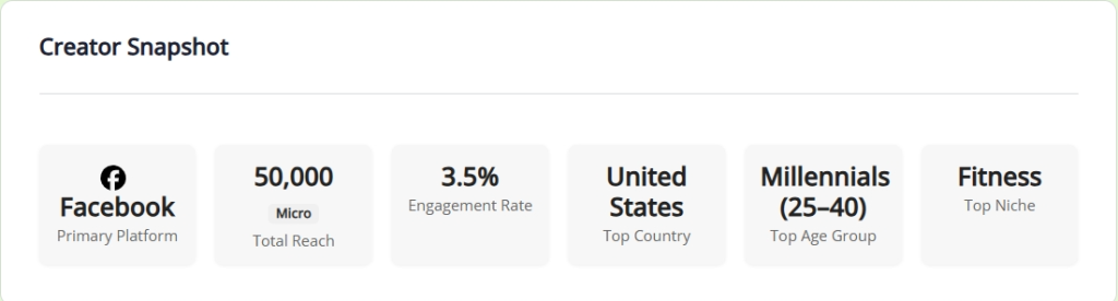Your profile includes two highโ€‘impact Snapshot sections. These act as quickโ€‘scan โ€œscorecardsโ€ that help partners, brands, and investors understand your influence and traction at a glance.